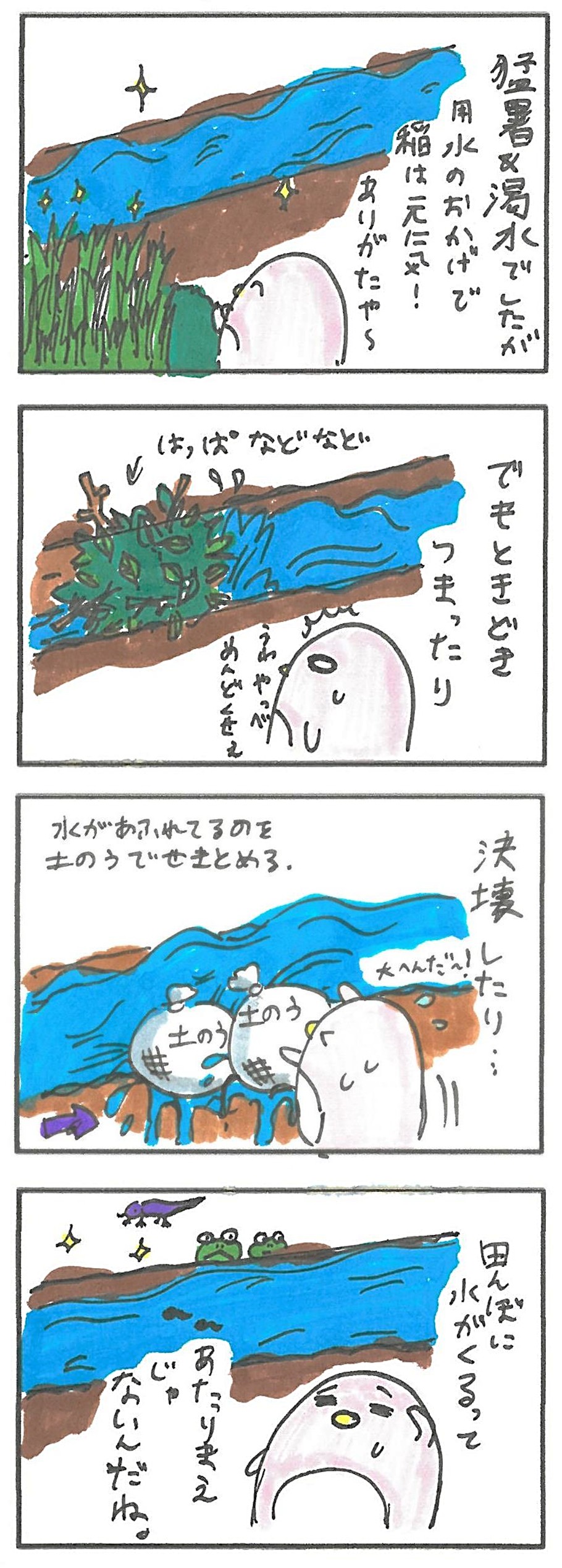 今年は梅雨時期の7月に雨が降らず、市内は田んぼも畑も、飲み水もピンチでした。中ノ俣角間の棚田は用水のおかげで稲は元気ですが、その用水も老朽化でまめな手入れや管理なしには水が流れません。用水チェック後に田んぼに水が届いたときには、安心感と達成感が入り交じり、角間用水を作ってくれた先人に感謝・感謝です!