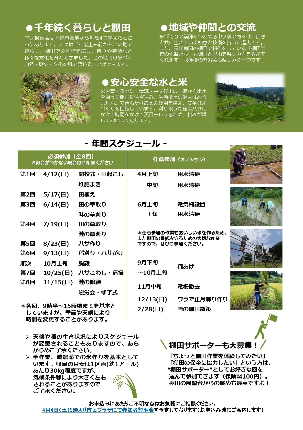 第23期 棚田学校 募集中! お知らせ 2026.3.1 中ノ俣の棚田で、真剣にお米作り・仲間作りを楽しみます! チラシのPDFファイルはこちら→R8棚田学校チラシ チラシのPDFファイルはこちら→R8棚田学校チラシ お申込み・お問い合わせは、かみえちご山里ファン倶楽部メールへお願いします→kamiechigo@nifty.com